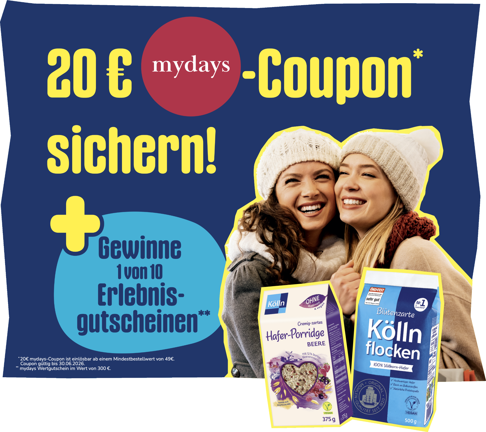 Im Anschluss an das Hochladen des Kassenbons kann jeder Teilnehmer zusätzlich bei dem Gewinnspiel mitmachen und einen von zehn Erlebnisgutscheinen der mydays GmbH (mydays Wertgutscheine) im Wert von jeweils 300,00 € gewinnen (gültig bis 31.12.2028). Die Wertgutscheine werden per Zufallsprinzip am Ende der Aktion verlost. Die Gewinner/Gewinnerinnen erhalten innerhalb von 14 Tagen nach Aktionsende/Auslosung eine entsprechende Benachrichtigung per E-Mail. Der Gewinnanspruch ist nicht auf andere Personen übertragbar. Eine Barauszahlung des Gewinns ist nicht möglich und der Wert der Gutscheine aus dem Gewinnspiel kann nicht zum Bezahlen von Kölln-Produkten verwendet werden und nicht mit anderen Aktionen / Rabatten von mydays bzw. Kölln kombiniert werden. Es gelten auch hier die AGB der mydays GmbH, die unter www.mydays/agb eingesehen werden können. Der Rechtsweg ist in Bezug auf Ansprüche aus der Gewinnspielteilnahme ausgeschlossen, und zwar gegen Kölln und mydays.